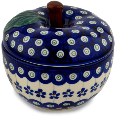 This polish pottery apple shaped jar (item number H7447C) is made by talented artisans from Poland. It is 4.5" high and measures 4.7" by 4.7". The weight of this apple shaped jar is 1.33 lbs.