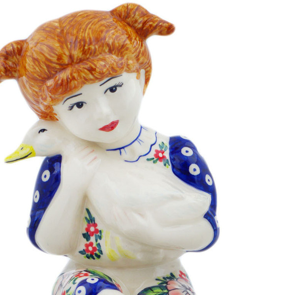 This polish pottery girl figurine (item number H1903Q) is made by talented artisans from Poland. It is 9" high and measures 6" by 7.1". The weight of this girl figurine is 2.39 lbs.