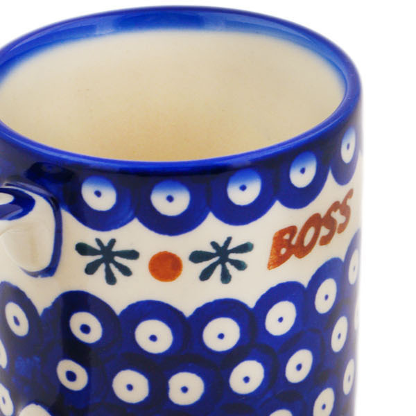 This polish pottery mug (item number H1387R) is made by talented artisans from Poland. It is 3.8" high and measures 3.5" by 4.7". It holds 13 ounces of fluid. The weight of this mug is 0.94 lbs.