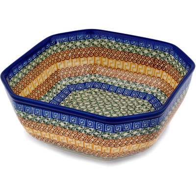 This polish pottery bowl (item number H8617K) is made by talented artisans from Poland. It is 3.5" high and measures 9" by 9". It holds 86 ounces of fluid. The weight of this bowl is 3.23 lbs.