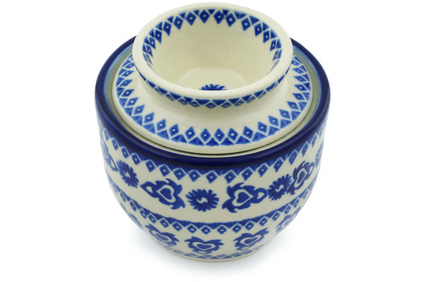 A: A French butter dish is a container used to maintain the freshness and spreadable consistency of butter without refrigeration. This late 19th century French-designed pottery crock has two parts: a base that holds water, and a cup to hold the packed butter which also serves as a lid. The cup containing butter is placed into the base, where water creates an airtight seal that keeps the air (and thus oxygen) away from the butter so that refrigeration is not needed, and the butter can be used in its