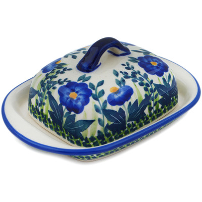 This polish pottery butter dish (item number H2216P) is made by talented artisans from Poland. It is 2.6" high and measures 4.4" by 6.1". The weight of this butter dish is 0.88 lbs.