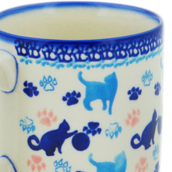 This polish pottery mug (item number H0219O) is made by talented artisans from Poland. It is 3.8" high and measures 3.5" by 4.7". It holds 13 ounces of fluid. The weight of this mug is 0.94 lbs.