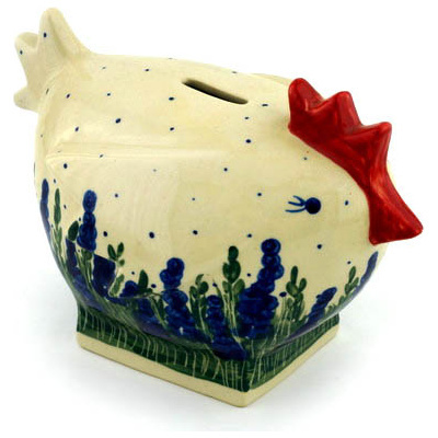 This polish pottery chicken shaped piggy bank (item number H0138C)