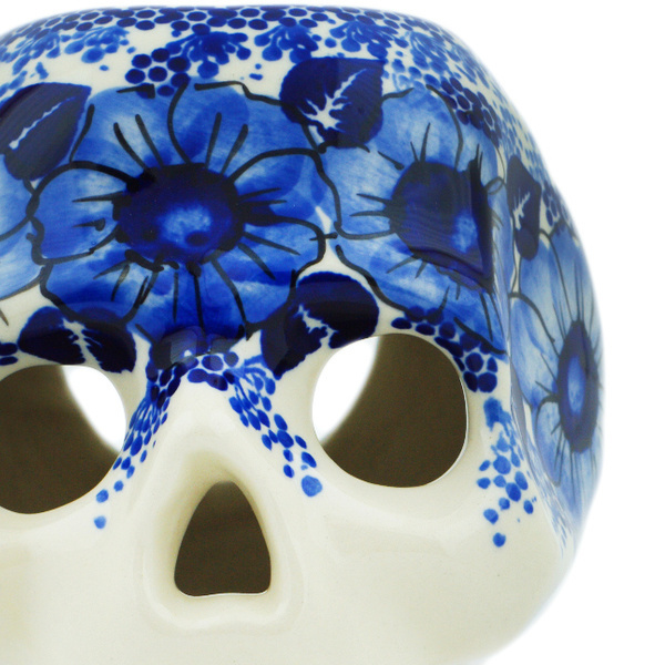 This polish pottery skull figurine (item number H5776N) is made by talented artisans from Poland. It is 4.7" high and measures 4.8" by 5.6". It holds 1 ounces of fluid. The weight of this skull figurine is 1.02 lbs.