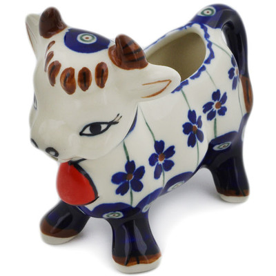 This polish pottery cow shaped creamer (item number H1328L) is made by talented artisans from Poland. It is 4.1" high and measures 2.6" by 4.9". It holds 3 ounces of fluid. The weight of this cow shaped creamer is 0.46 lbs.