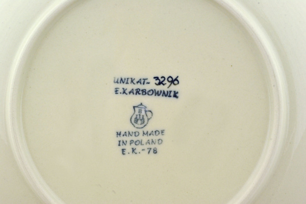 This is Polish Pottery Unikat (Signature) plate, which means that it has been hand painted with both sponges and brushes and it is signed by the artist who painted it. Unikat pieces are the most involving works of art. Larger Unikat items take a few hours of very careful work to finish.