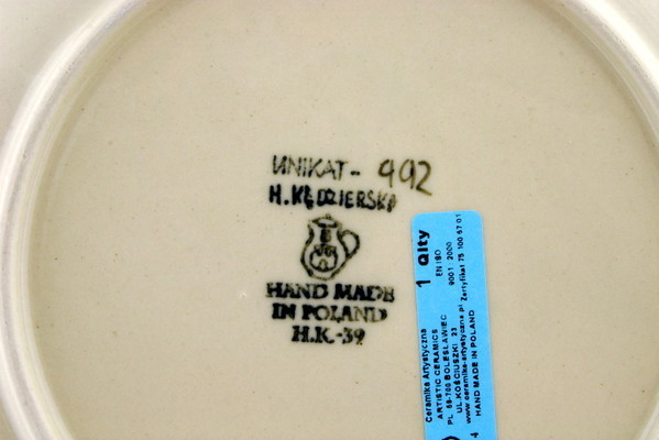 This is Polish Pottery Unikat (Signature) plate, which means that it has been hand painted with both sponges and brushes and it is signed by the artist who painted it. Unikat pieces are the most involving works of art. Larger Unikat items take a few hours of very careful work to finish.