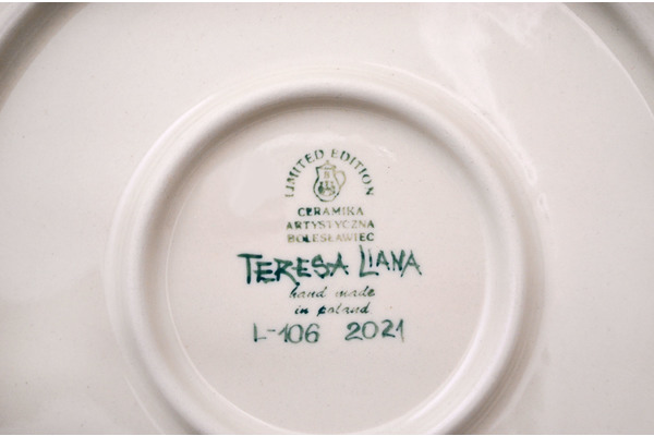 This is Polish Pottery Unikat (Signature) plate, which means that it has been hand painted with both sponges and brushes and it is signed by the artist who painted it. Unikat pieces are the most involving works of art. Larger Unikat items take a few hours of very careful work to finish.