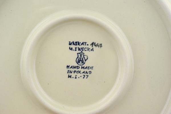 This is Polish Pottery Unikat (Signature) plate, which means that it has been hand painted with both sponges and brushes and it is signed by the artist who painted it. Unikat pieces are the most involving works of art. Larger Unikat items take a few hours of very careful work to finish.