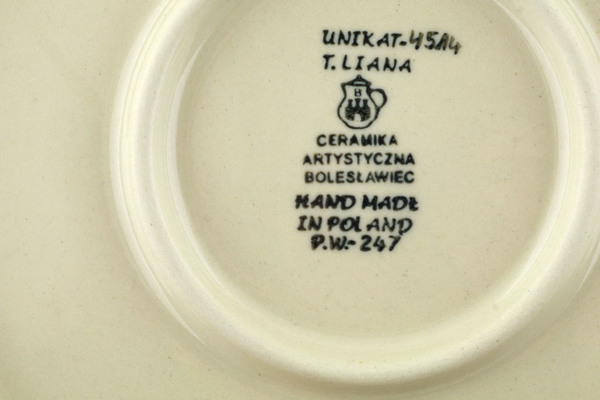 This is Polish Pottery Unikat (Signature) plate, which means that it has been hand painted with both sponges and brushes and it is signed by the artist who painted it. Unikat pieces are the most involving works of art. Larger Unikat items take a few hours of very careful work to finish.