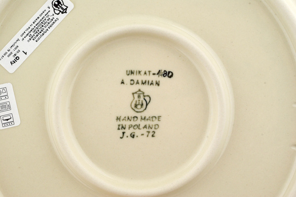 This is Polish Pottery Unikat (Signature) plate, which means that it has been hand painted with both sponges and brushes and it is signed by the artist who painted it. Unikat pieces are the most involving works of art. Larger Unikat items take a few hours of very careful work to finish.