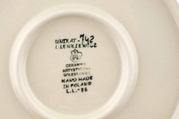 This is Polish Pottery Unikat (Signature) plate, which means that it has been hand painted with both sponges and brushes and it is signed by the artist who painted it. Unikat pieces are the most involving works of art. Larger Unikat items take a few hours of very careful work to finish.