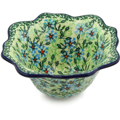 This polish pottery fluted bowl (item number H4643L) is made by talented artisans from Poland. It is 3.1" high and measures 6.7" by 6.7". The weight of this fluted bowl is 0.92 lbs.