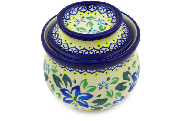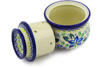 A: This butter dish / butter bell is a container used to maintain the freshness and spreadable consistency of butter without refrigeration. This late 19th century French-designed pottery crock has two parts: a base that holds water, and a cup to hold the packed butter which also serves as a lid. The cup containing butter is placed into the base, where water creates an airtight seal that keeps the air (and thus oxygen) away from the butter so that refrigeration is not needed, and the butter can be u