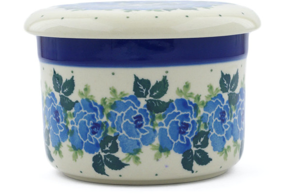 A: This late pottery crock has two parts: a base that holds water, and a cup to hold the packed butter which also serves as a lid. The cup containing butter is placed into the base, where water creates an airtight seal that keeps the air (and thus oxygen) away from the butter so that refrigeration is not needed, and the butter can be used in its soft form. This method will keep butter for around a month provided it is kept at temperatures below 80 °F (27 °C) and the water is changed regularly.