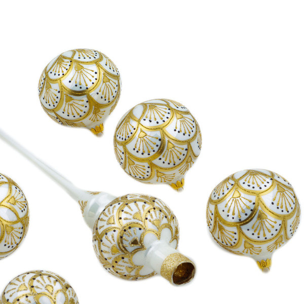This glass christmas ball ornament (item number H4558O) is made by talented artisans from Poland. It is 15" high and measures 3.6" by 3.6". The weight of this christmas ball ornament is 0.39 lbs.