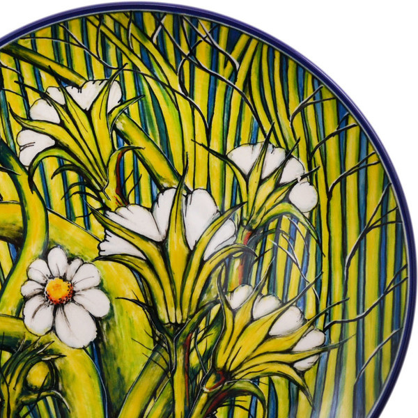 This polish pottery plate (item number H5042L) is made by talented artisans from Poland. It is 1.1" high and measures 10" by 9.9". The weight of this plate is 1.7 lbs.