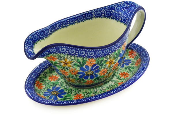 Unikat (Signature) gravy boat with saucer, which means that it has been hand painted with both sponges and brushes and it