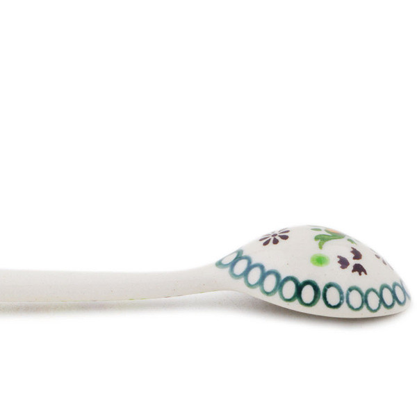 This polish pottery spoon (item number H6083Q) is made by talented artisans from Poland. It is 0.9" high and measures 1.6" by 6.2". The weight of this spoon is 0.08 lbs.