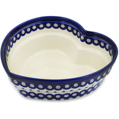 This polish pottery heart shaped bowl (item number H1402L) is made by talented artisans from Poland. It is 2.9" high and measures 8.4" by 8.7". The weight of this heart shaped bowl is 2.13 lbs.