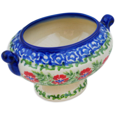 This polish pottery jar (item number H3373P) is made by talented artisans from Poland. It is 2.5" high and measures 3.3" by 4.7". It holds 5 ounces of fluid. The weight of this jar is 0.33 lbs.