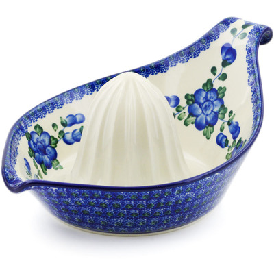 This polish pottery juice reamer (item number H3986O) is made by talented artisans from Poland. It is 4.3" high and measures 7.4" by 9.8". It holds 14 ounces of fluid. The weight of this juice reamer is 1.87 lbs.