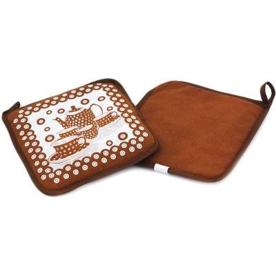 This textile kitchen pot holder set (item number H0506M) is made by talented artisans from Poland. It is 0.5" high and measures 6.9" by 6.9". The weight of this kitchen pot holder set is 0.11 lbs.
