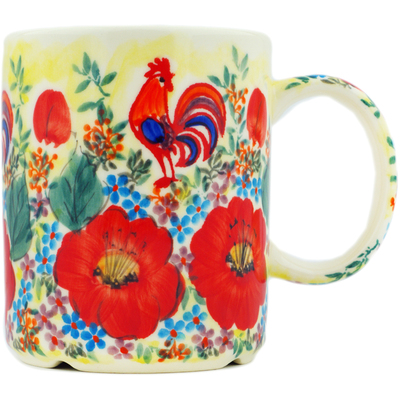 This polish pottery mug (item number H3744O) is made by talented artisans from Poland. It is 4.7" high and measures 3.9" by 5.9". It holds 20 ounces of fluid. The weight of this mug is 1.12 lbs.
