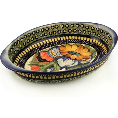 This polish pottery oval baker with handles (item number H3101N) is made by talented artisans from Poland. It is 2.1" high and measures 8.8" by 13.4". It holds 58 ounces of fluid. The weight of this oval baker with handles is 2.4 lbs.