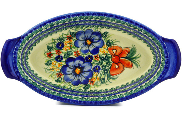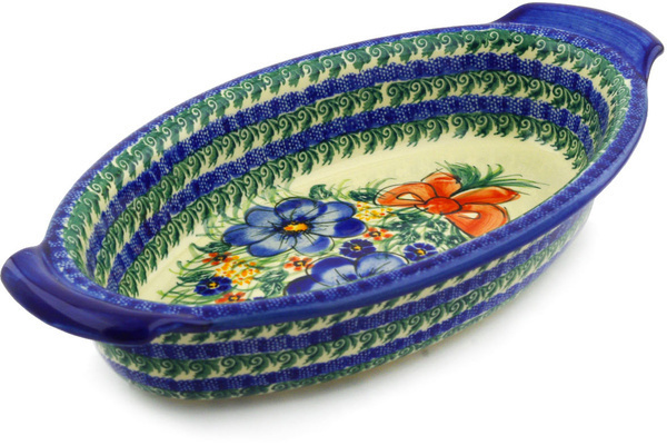 Unikat (Signature) oval baker with handles, which means that it has been hand painted with both sponges and brushes and it