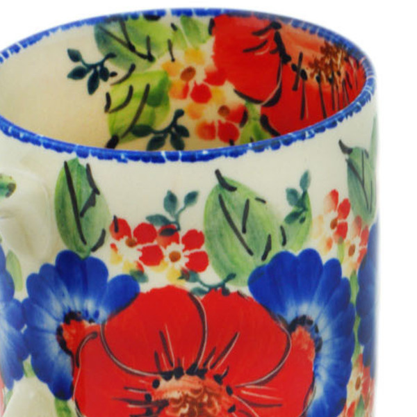 This polish pottery mug (item number H0524P) is made by talented artisans from Poland. It is 3.8" high and measures 3.5" by 4.7". It holds 13 ounces of fluid. The weight of this mug is 0.82 lbs.