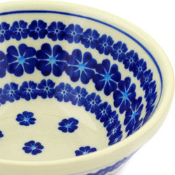 This polish pottery bowl (item number H6852F) is made by talented artisans from Poland. It is 1.2" high and measures 4.5" by 4.5". The weight of this bowl is 0.52 lbs.