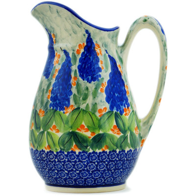 This polish pottery pitcher (item number H2815P) is made by talented artisans from Poland. It is 8.9" high and measures 5.4" by 6.7". It holds 52 ounces of fluid. The weight of this pitcher is 2.68 lbs.