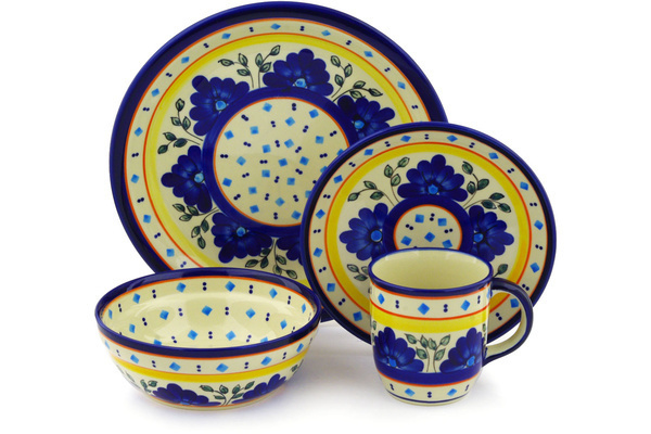 • Polish Pottery 4-Piece Place Setting Blue Cress UNIKAT