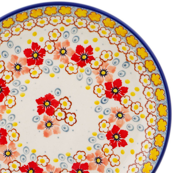 This polish pottery plate (item number H1371Q) is made by talented artisans from Poland. It is 1.2" high and measures 7.9" by 7.9". The weight of this plate is 1.04 lbs.