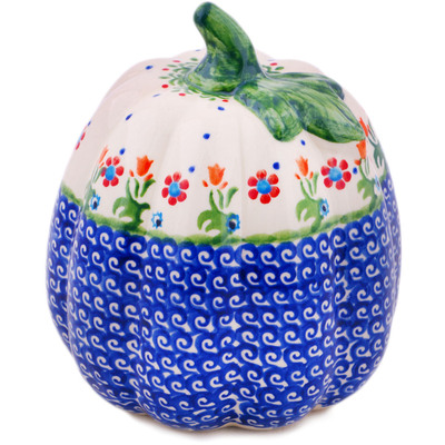 This polish pottery pumpkin figurine (item number H5100P) is made by talented artisans from Poland. It is 6.2" high and measures 5.6" by 5.6". The weight of this pumpkin figurine is 1.42 lbs.