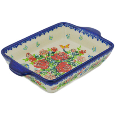 This polish pottery rectangular baker (item number H2469R) is made by talented artisans from Poland. It is 1.7" high and measures 5.9" by 8.7". It holds 19 ounces of fluid. The weight of this rectangular baker is 1.4 lbs.