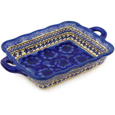 This polish pottery rectangular baker with handles (item number H7315E) is made by talented artisans from Poland. It is 2.5" high and measures 8.2" by 12.5". It holds 44 ounces of fluid. The weight of this rectangular baker with handles is 3.23 lbs.