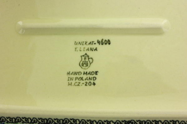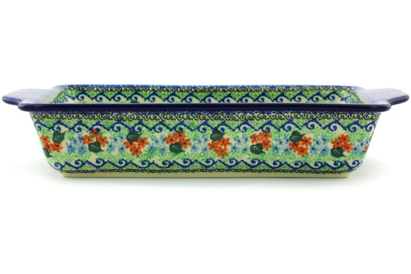 Unikat (Signature) rectangular baker with handles, which means that it has been hand painted with both sponges and brushes and it