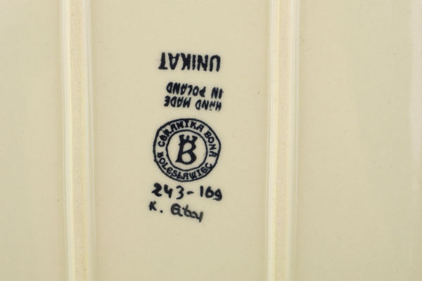 Unikat (Signature) rectangular baker with handles, which means that it has been hand painted with both sponges and brushes and it