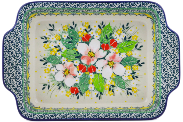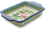 Unikat (Signature) rectangular baker with handles, which means that it has been hand painted with both sponges and brushes and it