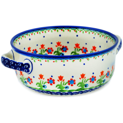 This polish pottery round baker with handles (item number H0303P) is made by talented artisans from Poland. It is 2.7" high and measures 6.5" by 8.2". It holds 31 ounces of fluid. The weight of this round baker with handles is 1.27 lbs.