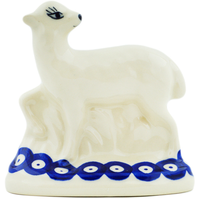 This polish pottery sheep figurine (item number H9932M) is made by talented artisans from Poland. It is 4.3" high and measures 1.7" by 4.3". The weight of this sheep figurine is 0.46 lbs.