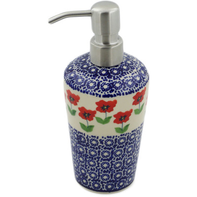 This polish pottery soap dispenser (item number H3826P) is made by talented artisans from Poland. It is 7.8" high and measures 3.3" by 3.3". It holds 13 ounces of fluid. The weight of this soap dispenser is 0.95 lbs.