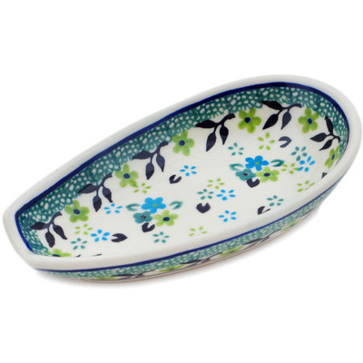 This polish pottery spoon rest (item number H5107P) is made by talented artisans from Poland. It is 1.3" high and measures 3.1" by 5.4". The weight of this spoon rest is 0.34 lbs.