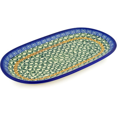 This polish pottery sugar and creamer tray (item number H3125C) is made by talented artisans from Poland. It is 1" high and measures 5.1" by 9.7". The weight of this sugar and creamer tray is 1.03 lbs.