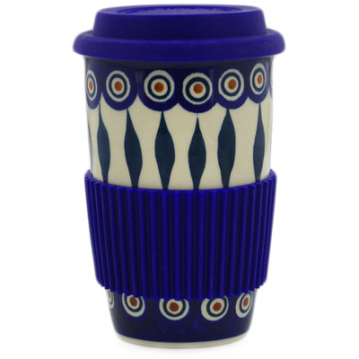 This polish pottery travel mug (item number H8590I) is made by talented artisans from Poland. It is 5.8" high and measures 3.7" by 3.7". It holds 15 ounces of fluid. The weight of this travel mug is 0.95 lbs.