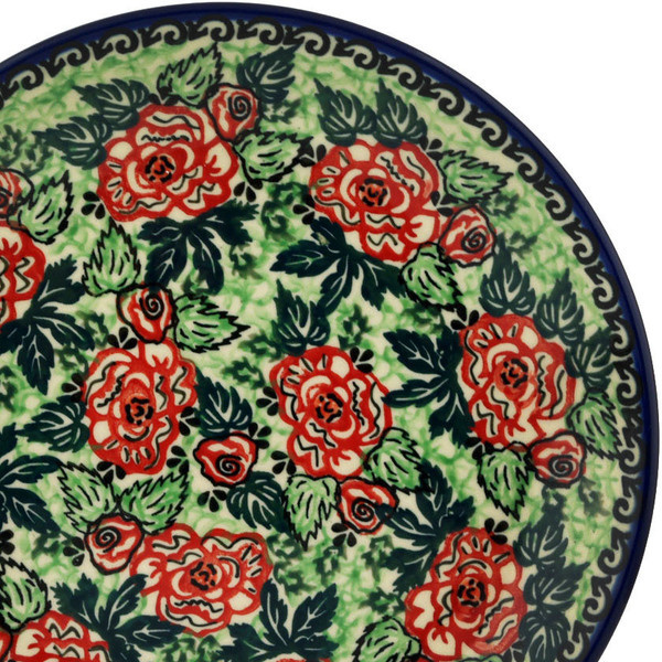 This polish pottery plate (item number H9144C) is made by talented artisans from Poland. It is 1.4" high and measures 10.5" by 10.5". The weight of this plate is 2.19 lbs.