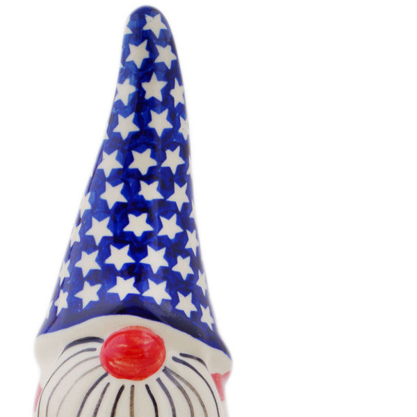 This polish pottery gnome figurine (item number H2006R) is made by talented artisans from Poland. It is 7.2" high and measures 2.8" by 3.3". The weight of this gnome figurine is 0.67 lbs.